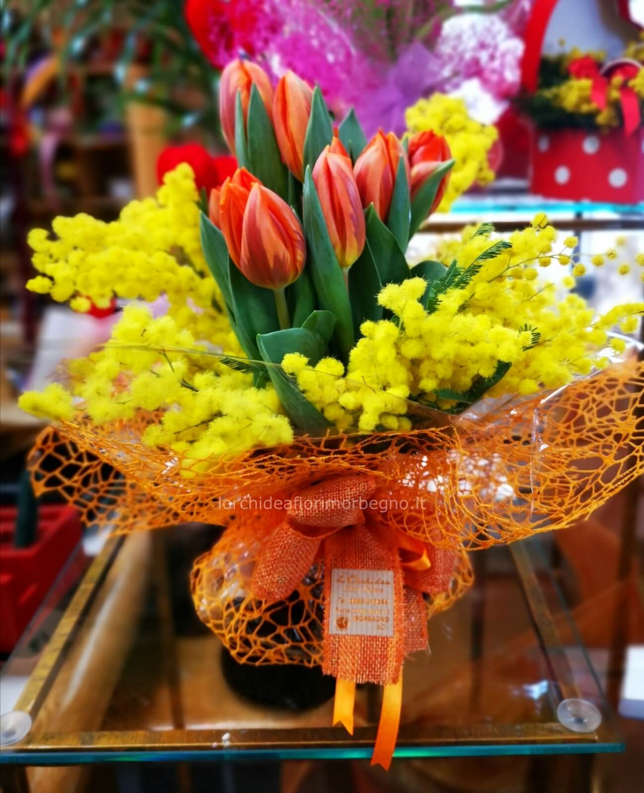 È composto da 10 tulipani con relativo bulbo e in occasione dell'8 mazzo avrà una corolla di mimosa.