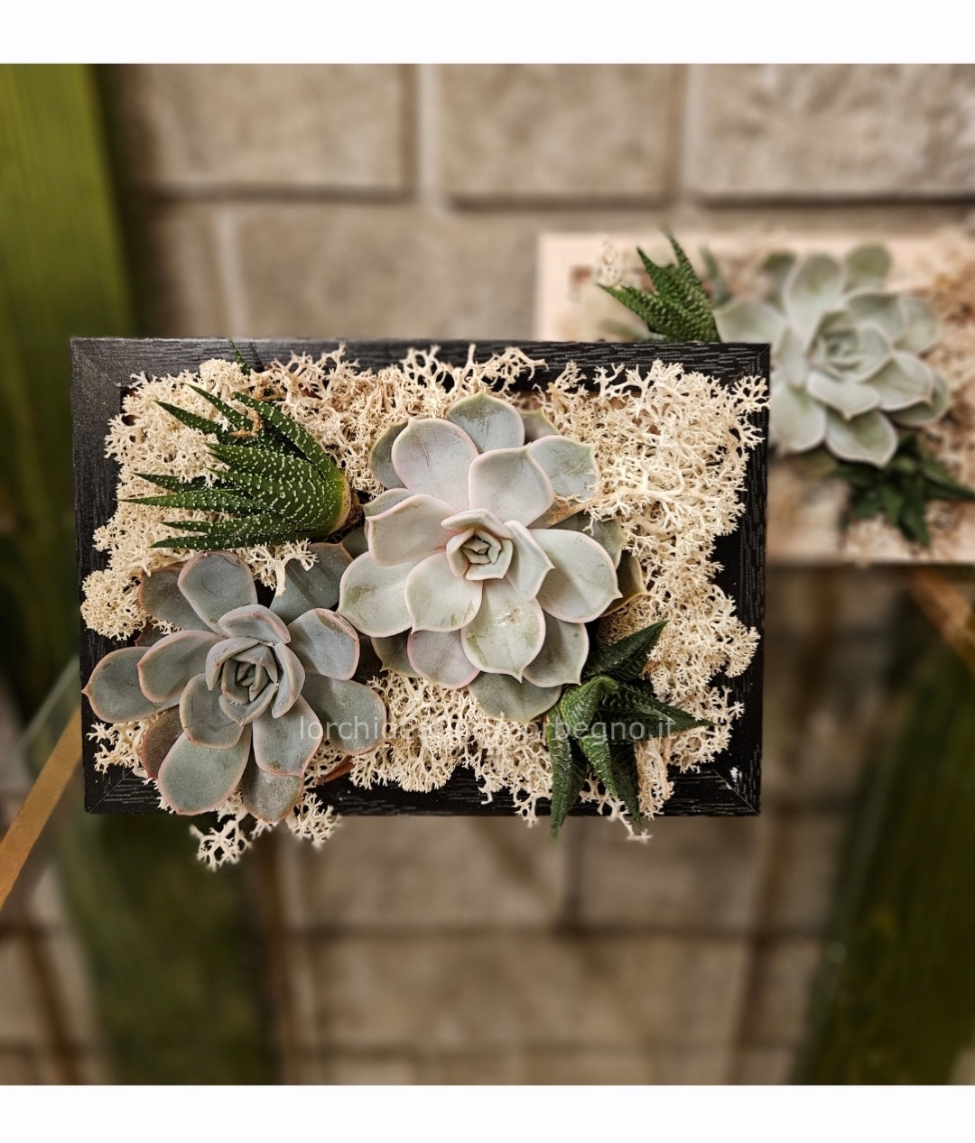Composizione artigianale di piante succulente realizzata su cornice (cm17x20), pensata come elemento decorativo dal design naturale e contemporaneo. Può essere utilizzata in appoggio su tavolo o scrivania, oppure appesa a parete come un vero e proprio quadro vegetale.